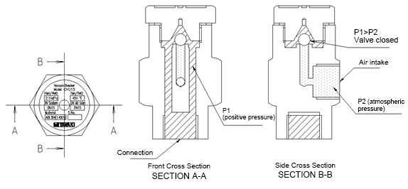 In a normal state, pressure P1 inside the line is applied to the connection, and the pressure P2 of the air intake is atmospheric pressure.