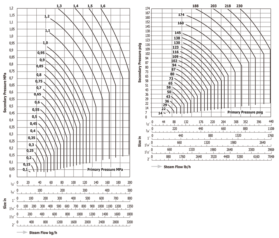 To reduce the pressure of 800kg/h (1764lb/h) of steam from 0,8MPa to 0,5MPa (116psig to 73psig)