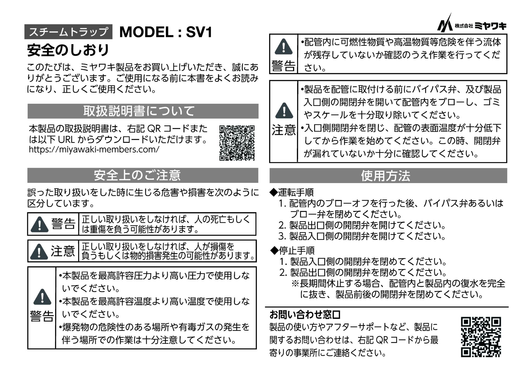 SV1:安全のしおりのみ、TB1N/TBU4: 安全のしおり+取扱説明書 (詳細は以下参照)