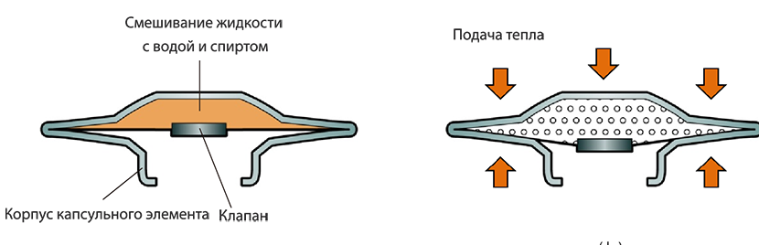 Как показано на рис. 2.9, термочувствительный элемент Diathermo представляет собой металлическую капсулу, заполненную смесью воды и спирта, температура насыщения которой немного ниже, чем у воды. При низких температурах жидкость в капсуле пребывает в жидком состоянии (а), а при высоких температурах испаряется и расширяется, выталкивая нижнюю поверхность, которая представляет собой клапан (б). При низких температурах жидкость конденсируется и возвращается в состояние (а). Клапан открывается и закрывается за счет расширения и сжатия.
